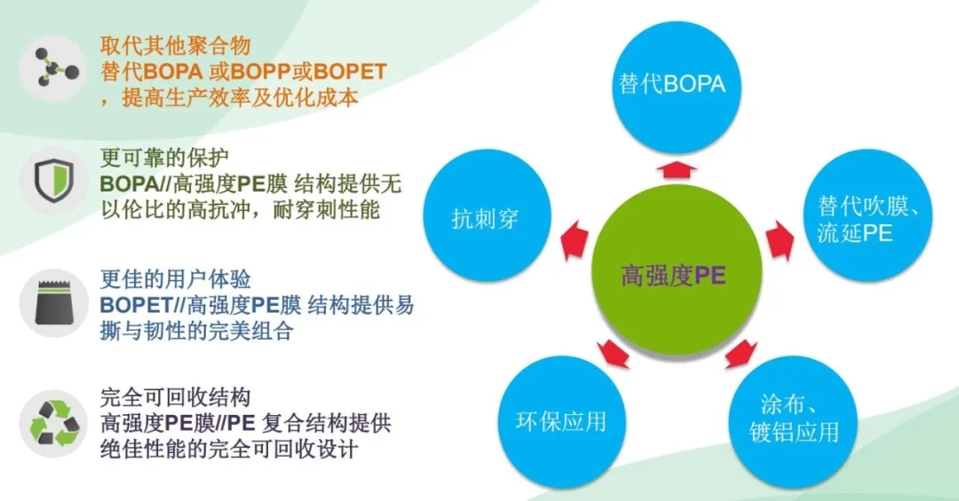 高強(qiáng)度PE膜,相比較傳統(tǒng)的PE吹膜或CPE膜,在提升機(jī)械強(qiáng)度的同時(shí),能實(shí)現(xiàn)材料輕量化,兼具優(yōu)異的光學(xué)性能、材料柔韌性,耐撕裂穿刺、耐揉折及熱封合牢固等優(yōu)點(diǎn)。